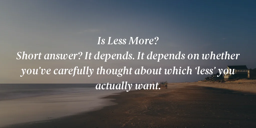 But is Less really More? Short answer? It depends. It depends on whether you’ve carefully thought about which ‘less’ you actually want. It depends on what you are willing to sacrifice. It depends on what best serves your audience. This is time consuming and exhausting and most of us simply don’t put in the hours needed to define what ‘less’ we really want. So we just opt for ‘more’. After all, ‘more is more’ gives you more than 12 million Google hits.